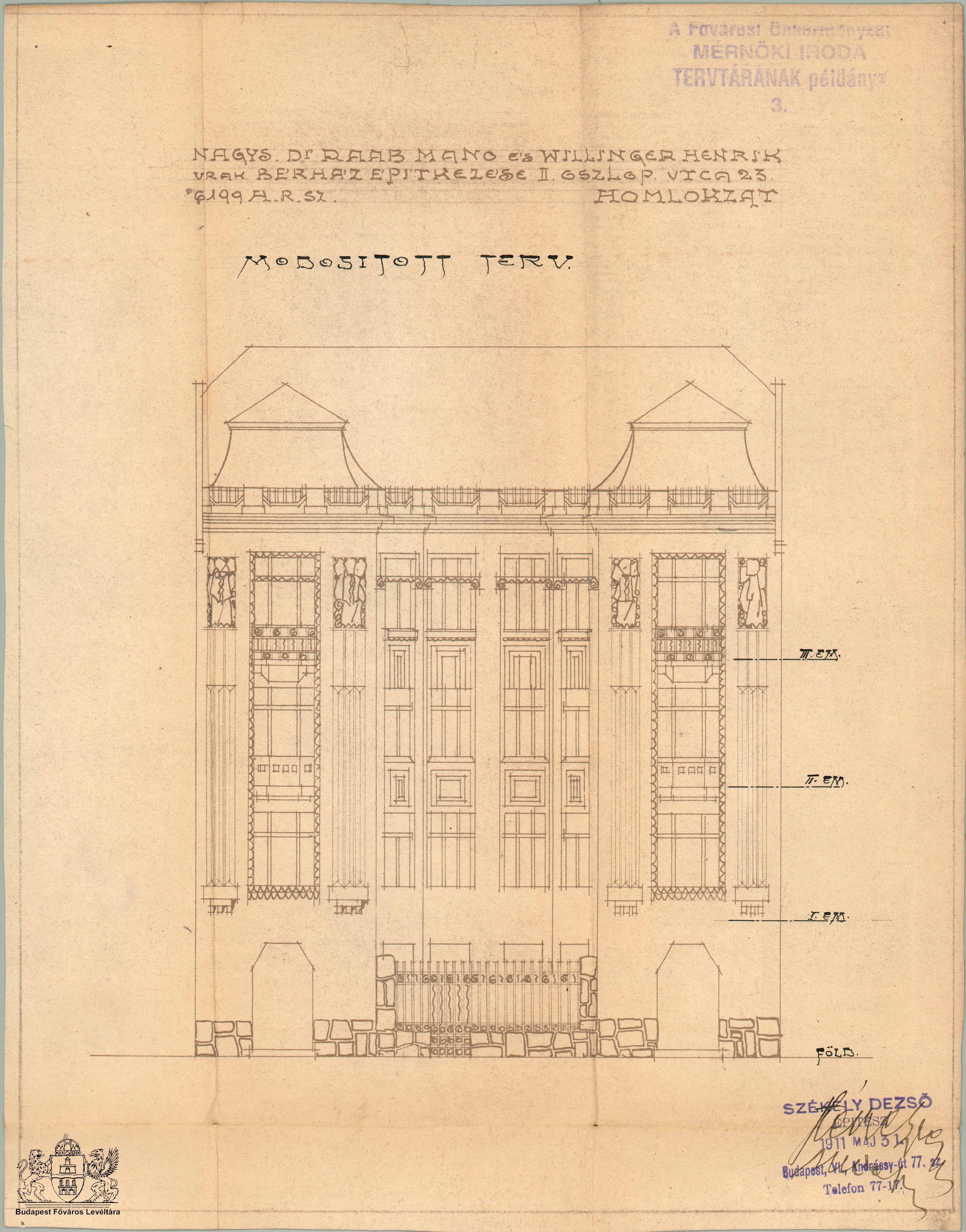Keleti Károly utca 23. Previous Toggle image Homlokzat (módosított terv) Type of document Tervek Date of creation 1911.05.31 Collection Budapest Főváros Levéltára Related work Keleti Károly utca 23. Reference code XV.17.d.329 Letöltés Previous