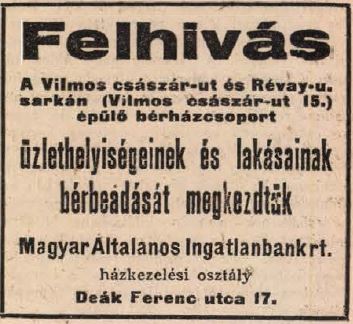 Bajcsy-Zsilinszky út 15/ a-b./Révay utca 2/a-b.-4., Révay köz 1-2. Toggle image Felhívás az elkészült bérházcsoport bérleményeinek kiadására Type of document Bérleti felhívás Date of creation 1928.08.23 Related work Bajcsy-Zsilinszky út 15/ a-b./Révay utca 2/a-b.-4., Révay köz 1-2. Reference code Budapesti Hírlap 1928.08.23. Letöltés