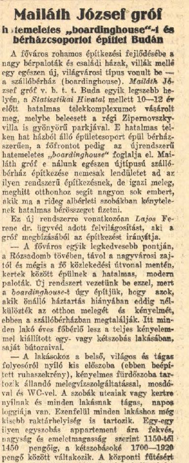 Mailáth bérházak: szálloda-bérház Next Toggle image Újságcikk a Mailáth boarding-house építéséről Type of document Újságcikk a Mailáth boarding-house építéséről Date of creation 1929.05.05 Related work Mailáth bérházak: szálloda-bérház Reference code Budapesti Hírlap 1929.05.05. Letöltés Next