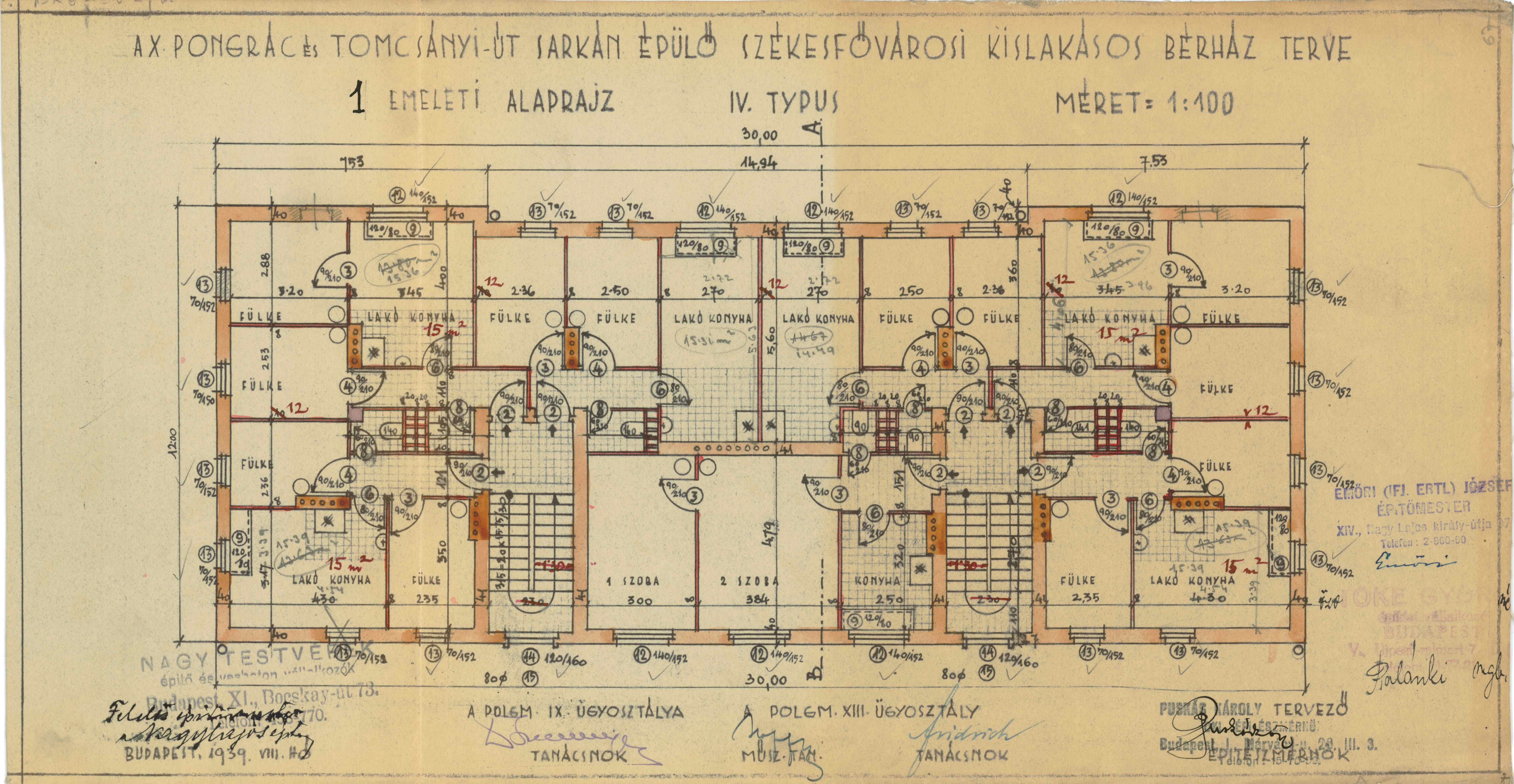 Pongrác út - Tomcsányi út sarkán építendő kislakásos épület IV. típus, I. emeleti alaprajz