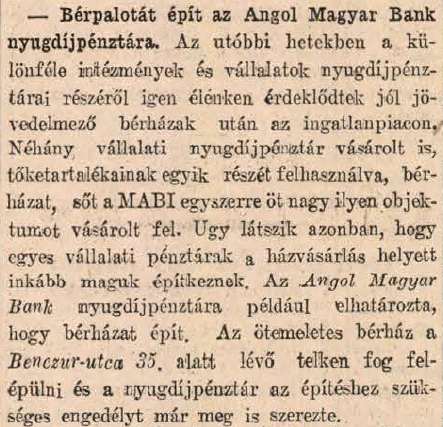 Benczúr utca 35/c Toggle image Angol-Magyar Bank bérházépítése Type of document újságcikk az építkezésről Date of creation 1932.04.08 Related work Benczúr utca 35/c Reference code Budapesti Hírlap Letöltés