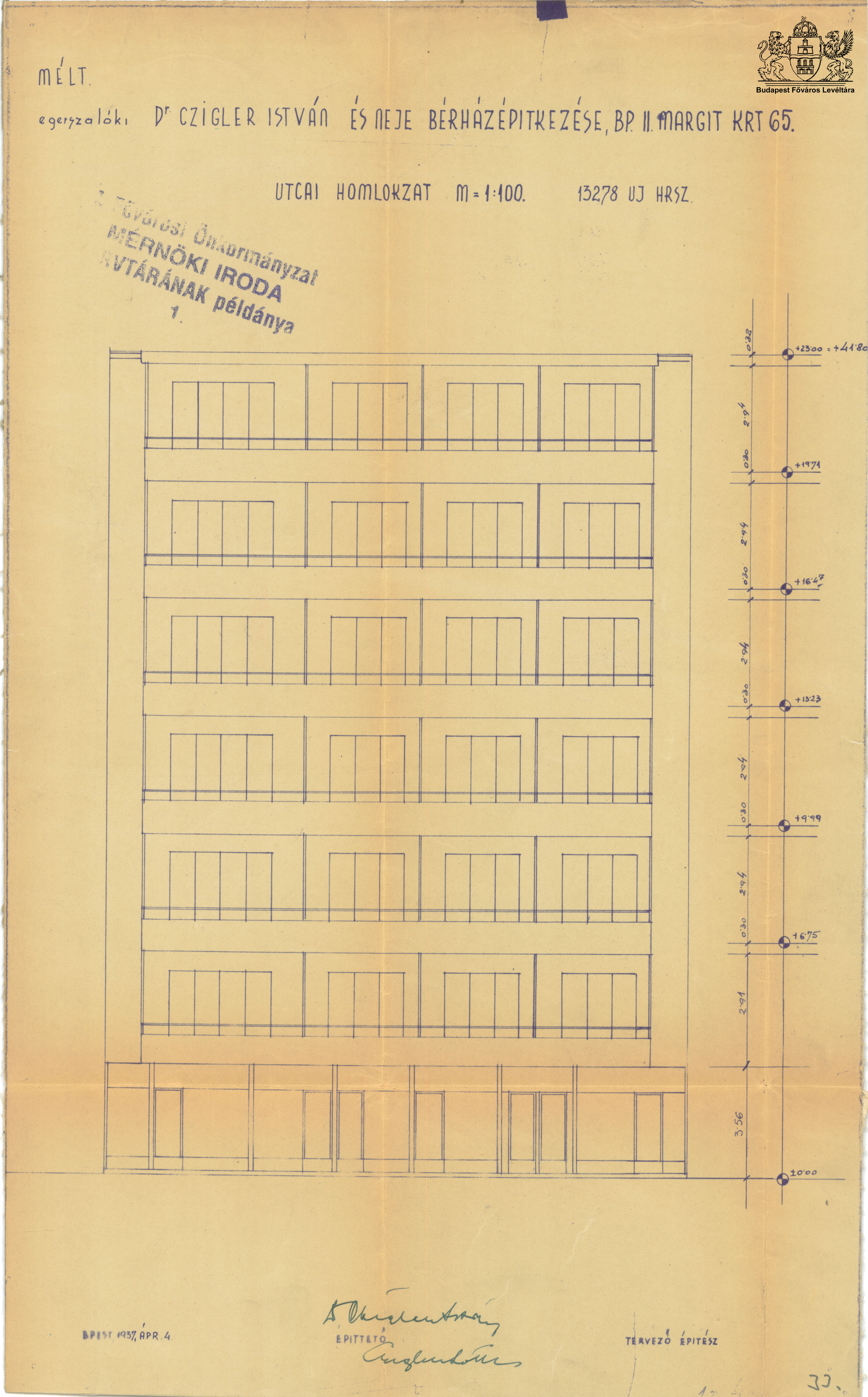 Margit körút 65. PreviousNext Toggle image Utcai homlokzat Type of document Tervek Date of creation 1937.04 Collection Budapest Főváros Levéltára Related work Margit körút 65. Reference code XV.17.d.329 Letöltés PreviousNext