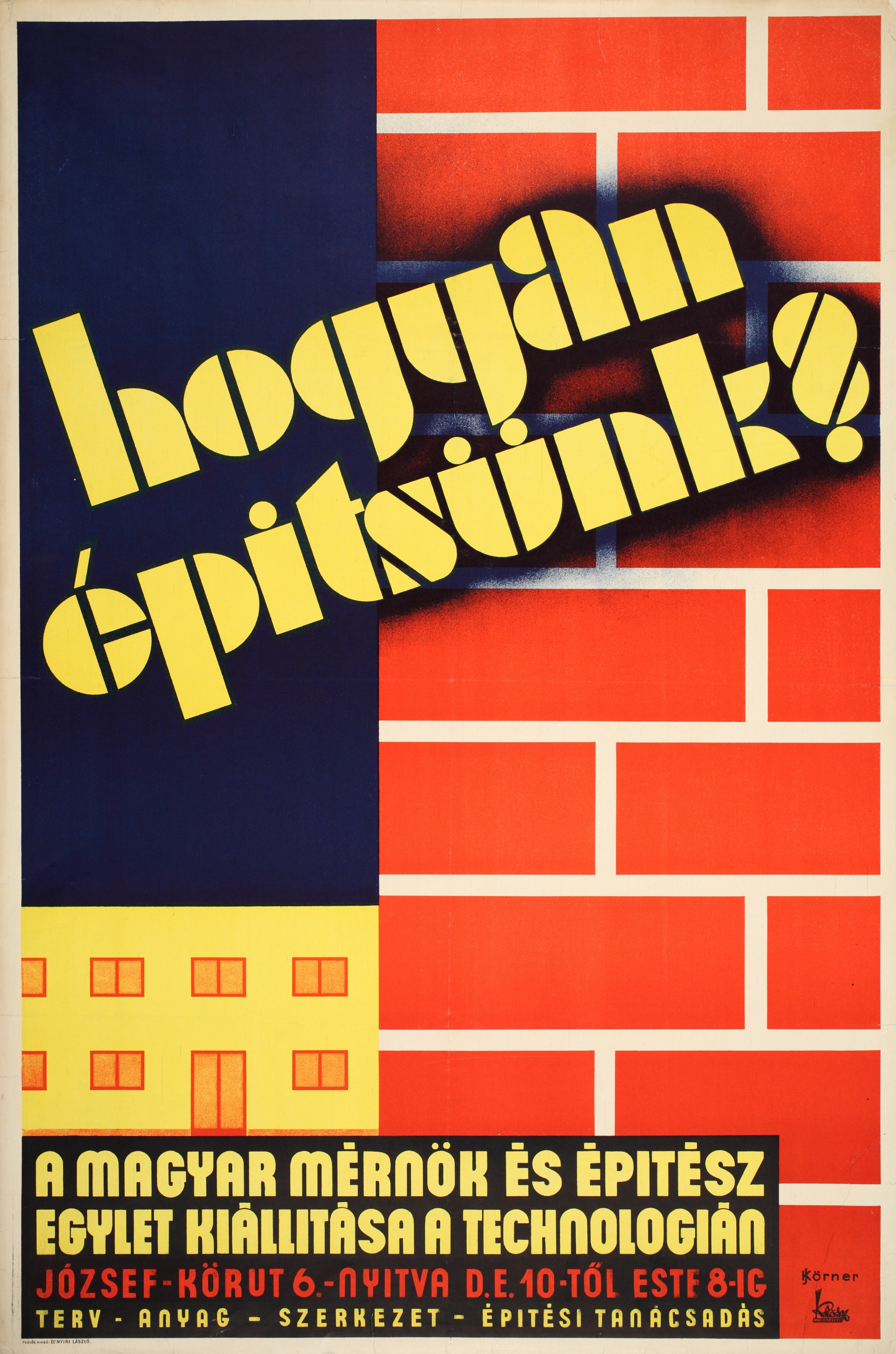 Építészeti nevelés, építészeti propaganda PreviousNext Toggle image A "Hogyan építsünk?" kiállítás plakátja (tervezte: Körner József) Subject A Hogyan építsünk? elnevezésű propaganda-mozgalom Date of creation 1931 Related work Építészeti nevelés, építészeti propaganda Reference code Országos Széchényi Könyvtár, PKG 1931/94 Letöltés PreviousNext