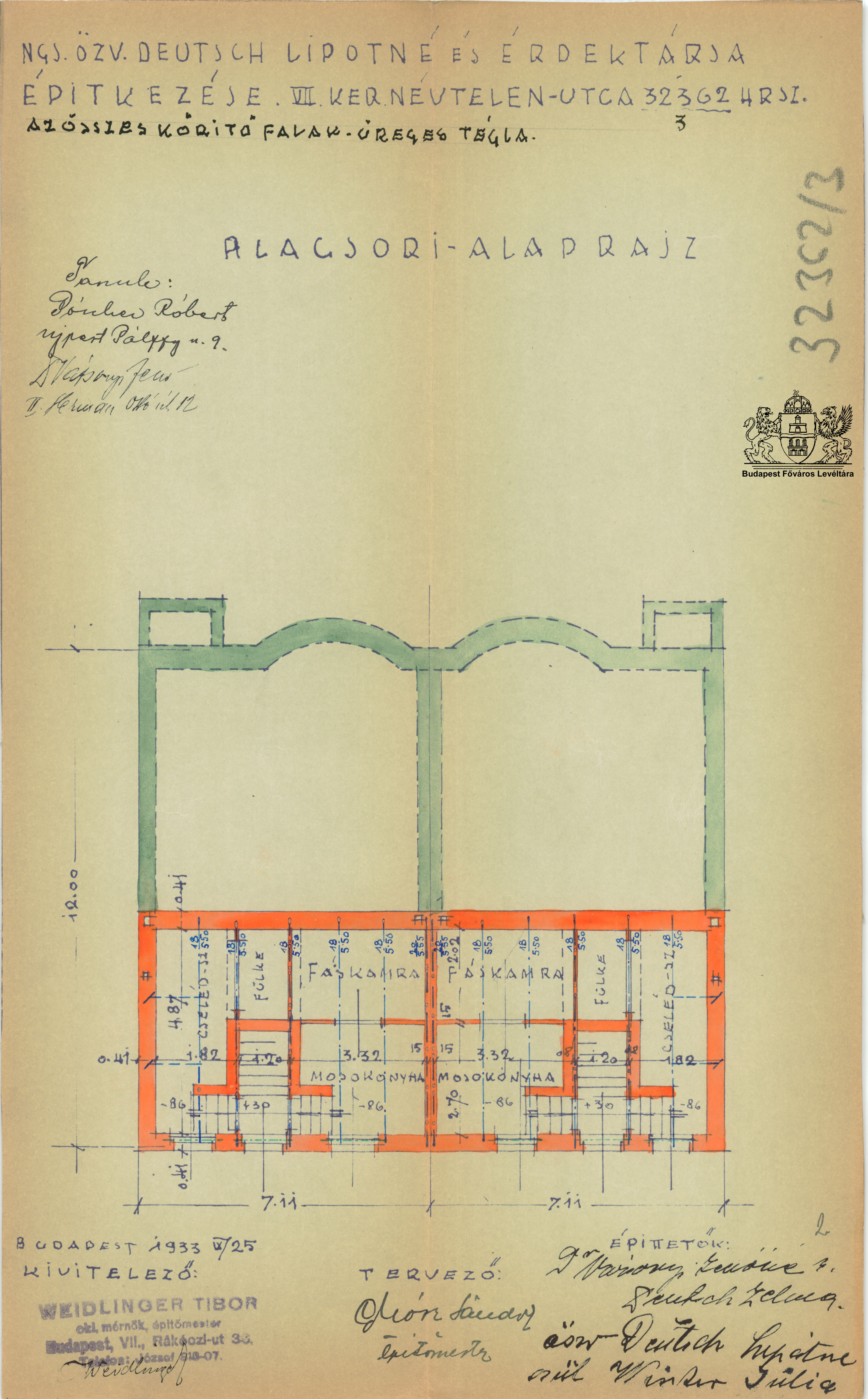 Cserei köz ikerházas beépítése Next Toggle image Alagsor Építtető: özv. Deutsch Lipótné sz. Winker Júlia, dr. Vázsonyi Jenőné sz. Deutsch Zelma Tervező: Grósz Sándor építőmester Épült: 1933-1934 Type of document Cserei köz 13-15. Date of creation 1933.09.25 Collection Budapest Főváros Levéltára Related work Cserei köz ikerházas beépítése Reference code XV.17.d.329 32362/3 Letöltés Next