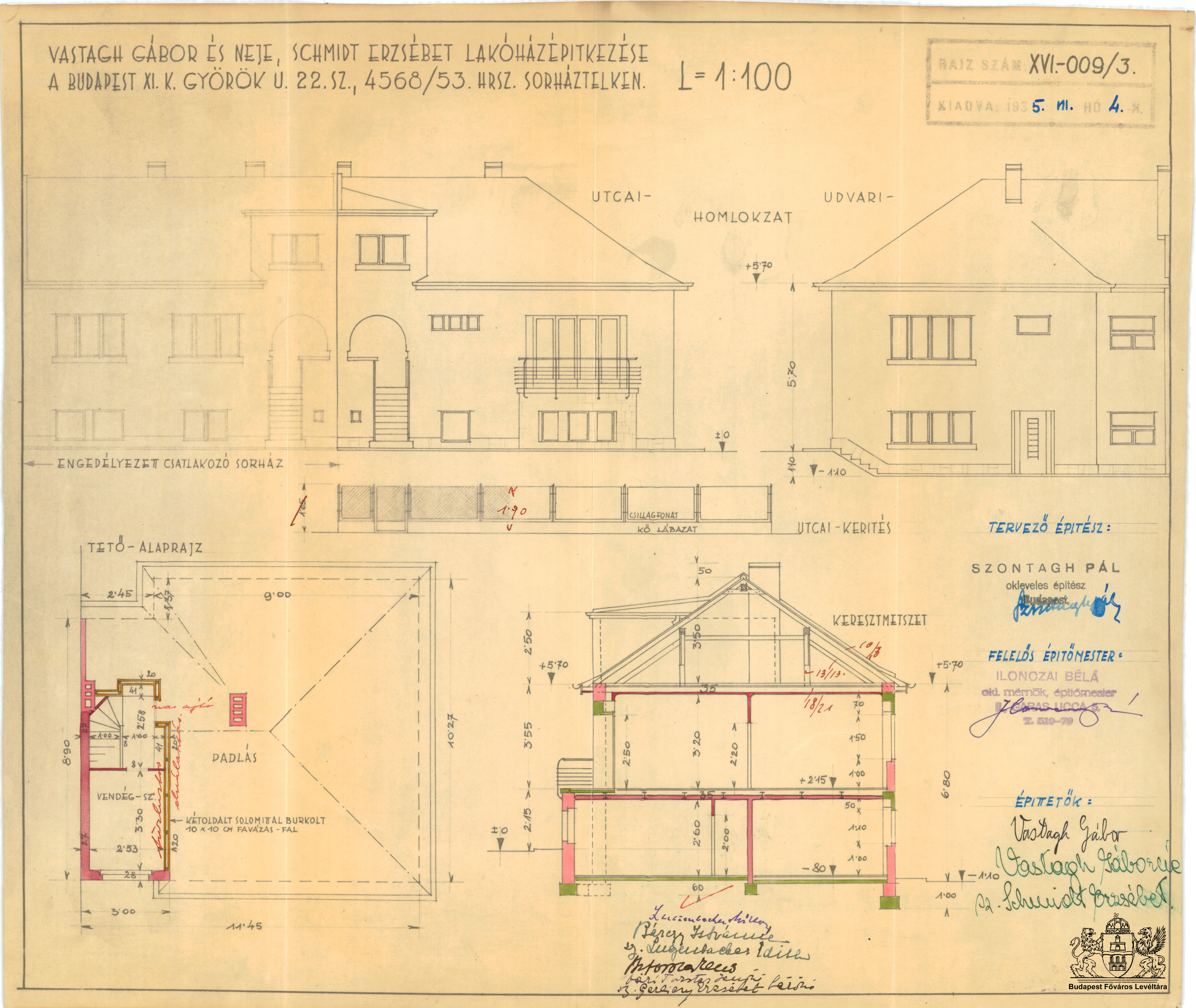 Sorházak a Györök utcában és a Takács Menyhért utcában PreviousNext Toggle image Györök utca 13. (homlokzat) Építtető: Vastagh Gábor és Vastagh Gáborné sz. Schmidt Erzsébet Tervező: Szontagh Pál okl.építész Épült: 1935 Type of document Egyéni építkezések Date of creation 1935.07.04 Collection Budapest Főváros Levéltára Related work Sorházak a Györök utcában és a Takács Menyhért utcában Reference code XV.17.d.329 4568/53 Letöltés PreviousNext