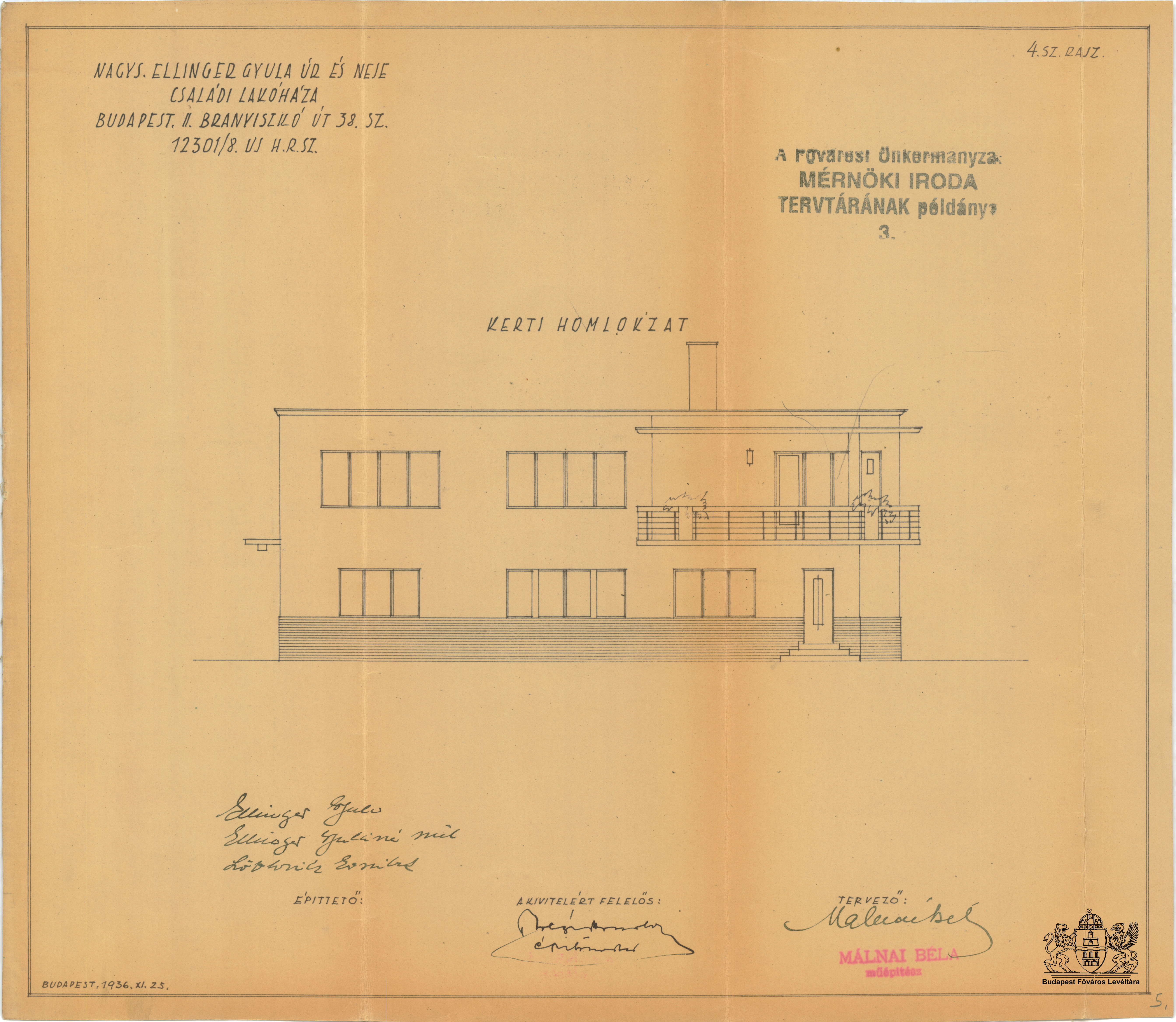 Virág árok 17./Branyiszkó út 38. PreviousNext Toggle image Kerti homlokzat Type of document Tervek Date of creation 1936.11.25 Collection Budapest Főváros Levéltára Related work Virág árok 17./Branyiszkó út 38. Reference code XV.17.d.329 Letöltés PreviousNext
