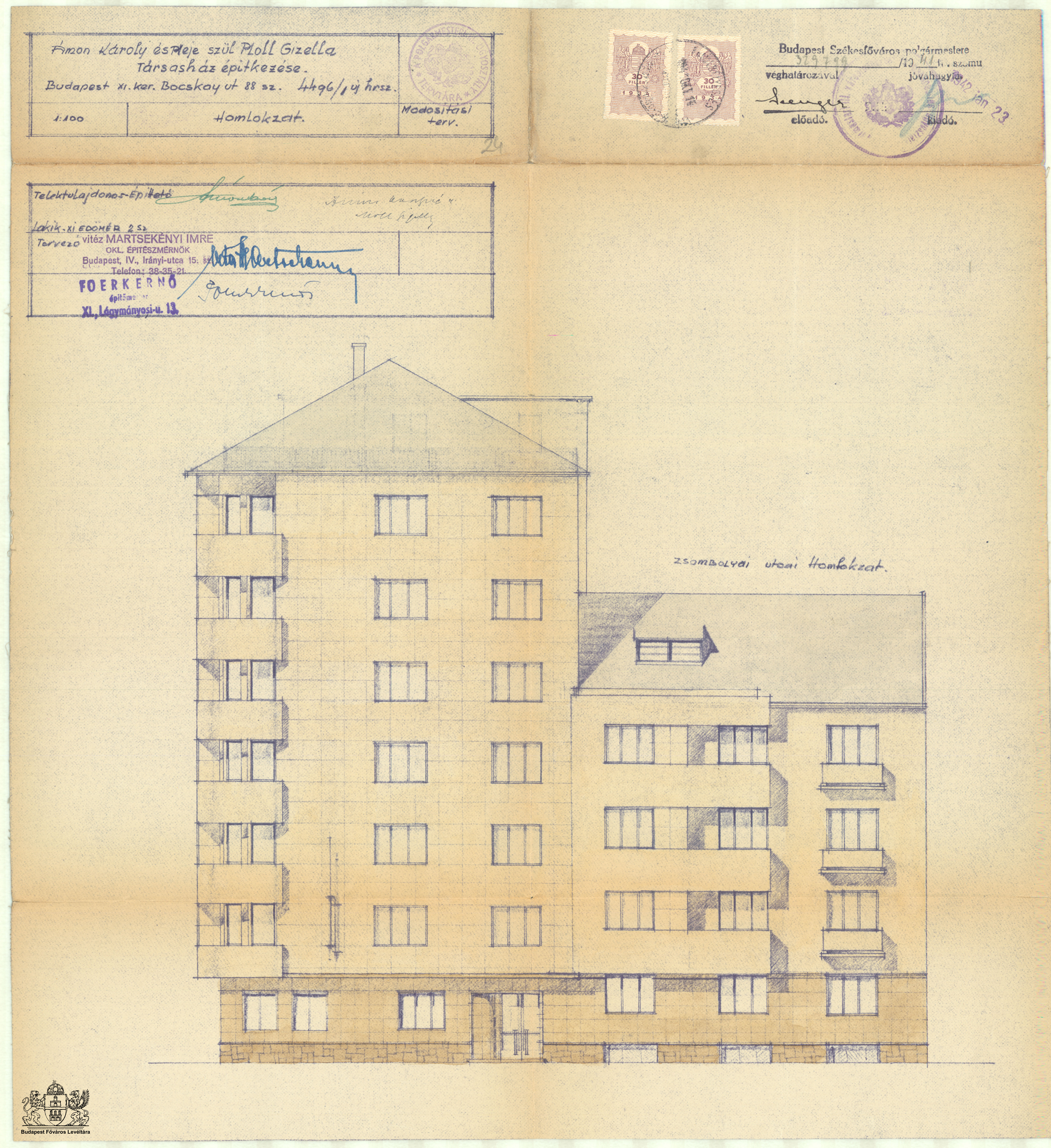 Bocskai út 42. Previous Toggle image Homlokzat (Zsombolyai utca felől) (módosított terv) Type of document Tervek Date of creation 1941 Collection Budapest Főváros Levéltára Related work Bocskai út 42. Reference code XV.17.d.329 Letöltés Previous