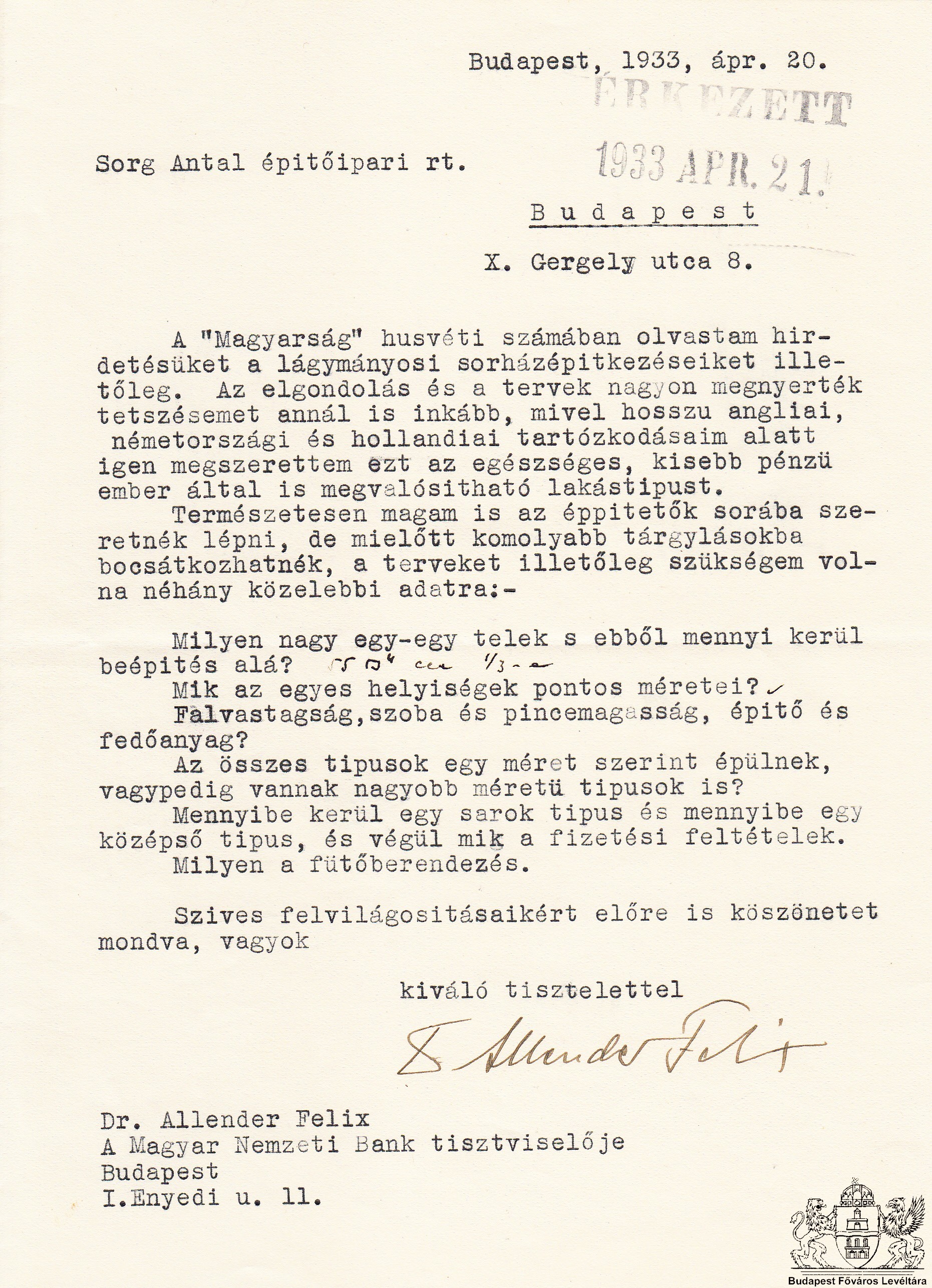 Sorházak a Györök utcában és a Takács Menyhért utcában PreviousNext Toggle image Egy újsághirdetés nyomán érdeklődő lakos levele a céghez Dokumentum típusa A Sorg Antal Építőipari Rt. sorházépítkezésének iratai Keletkezés ideje 1933.04.20 Őrzési hely Budapest Főváros Levéltára Vonatkozó alkotás Sorházak a Györök utcában és a Takács Menyhért utcában Jelzet XV.17.f.834 Letöltés PreviousNext