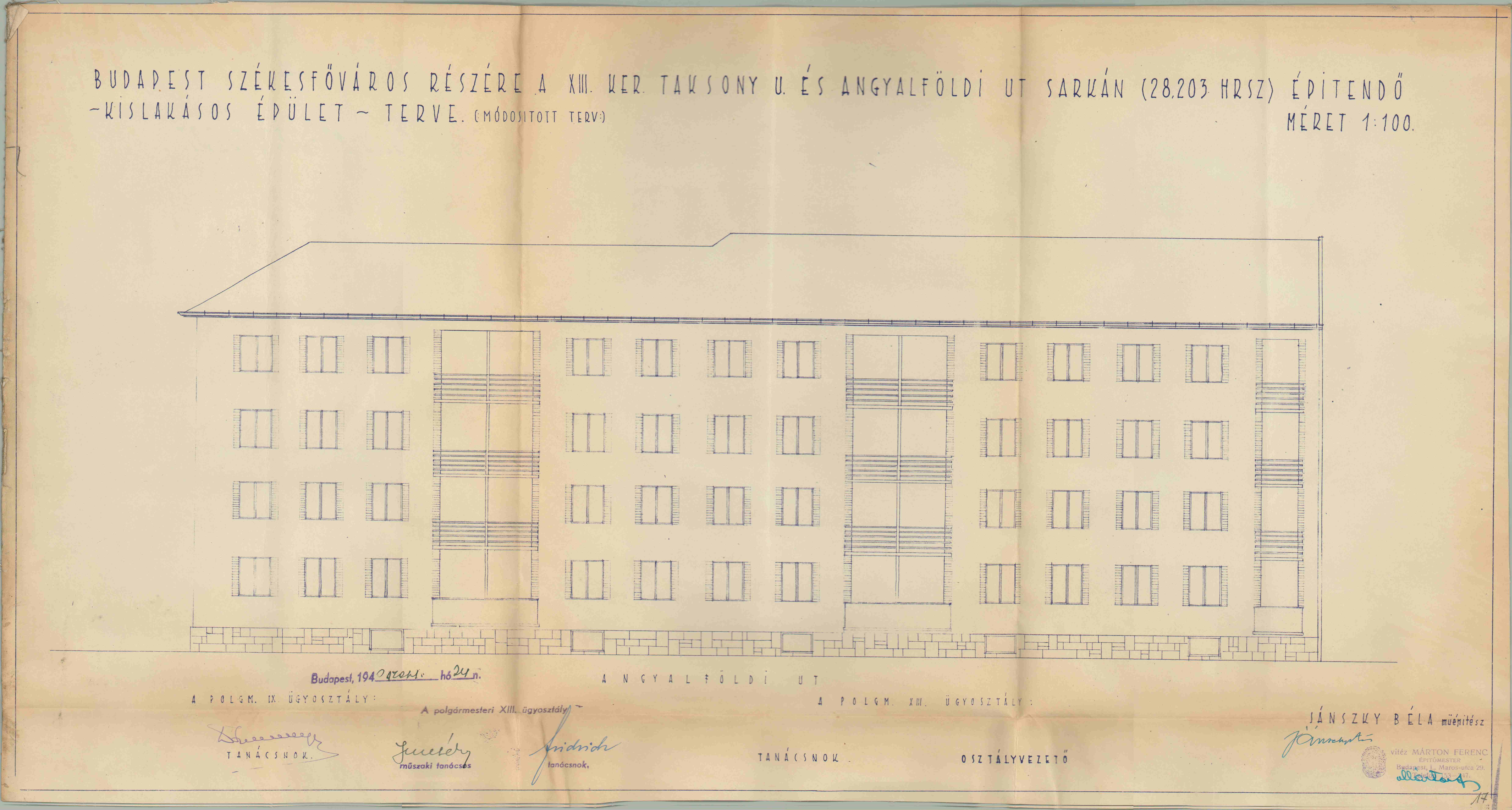XIII. Taksony utca 14. PreviousNext Toggle image XIII. Taksony utca 14. kislakásos bérház Angyaföldi úti homlokzat Type of document Tervrajz Date of creation 1939 - 1939 Related work XIII. Taksony utca 14. Reference code HU BFL XV.17.d.329 - 28203. 17. fol. Author Jánszky Béla Client Budapest Letöltés PreviousNext