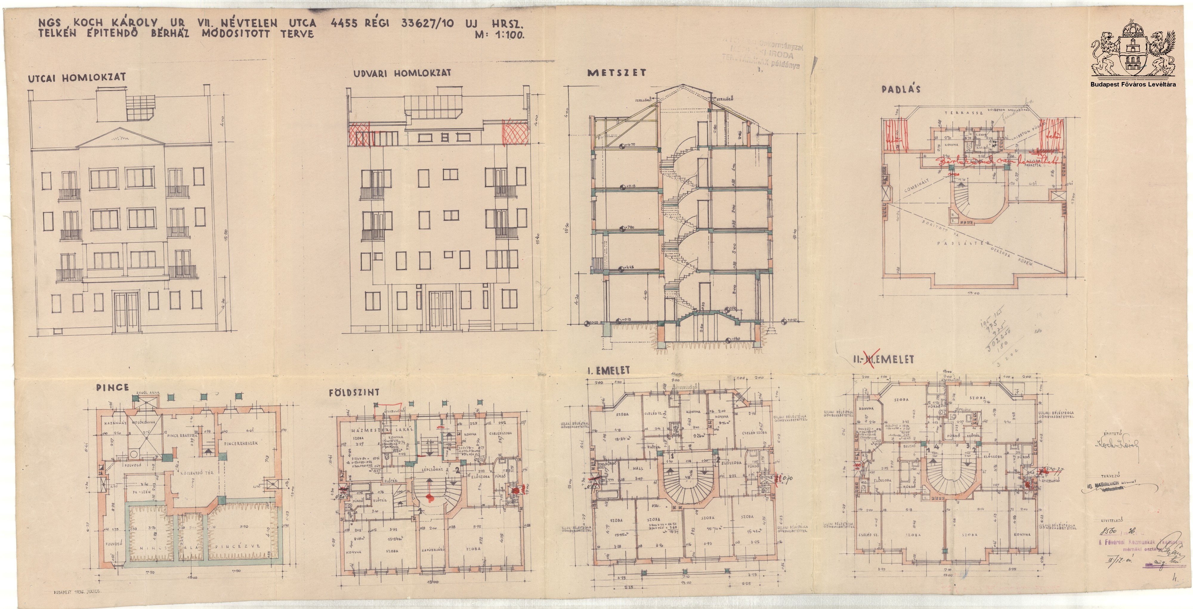 egy lapon: udvari, utcai homlokzat, metszet, pince földszint, I-II. emelet, padlás tervrajzai