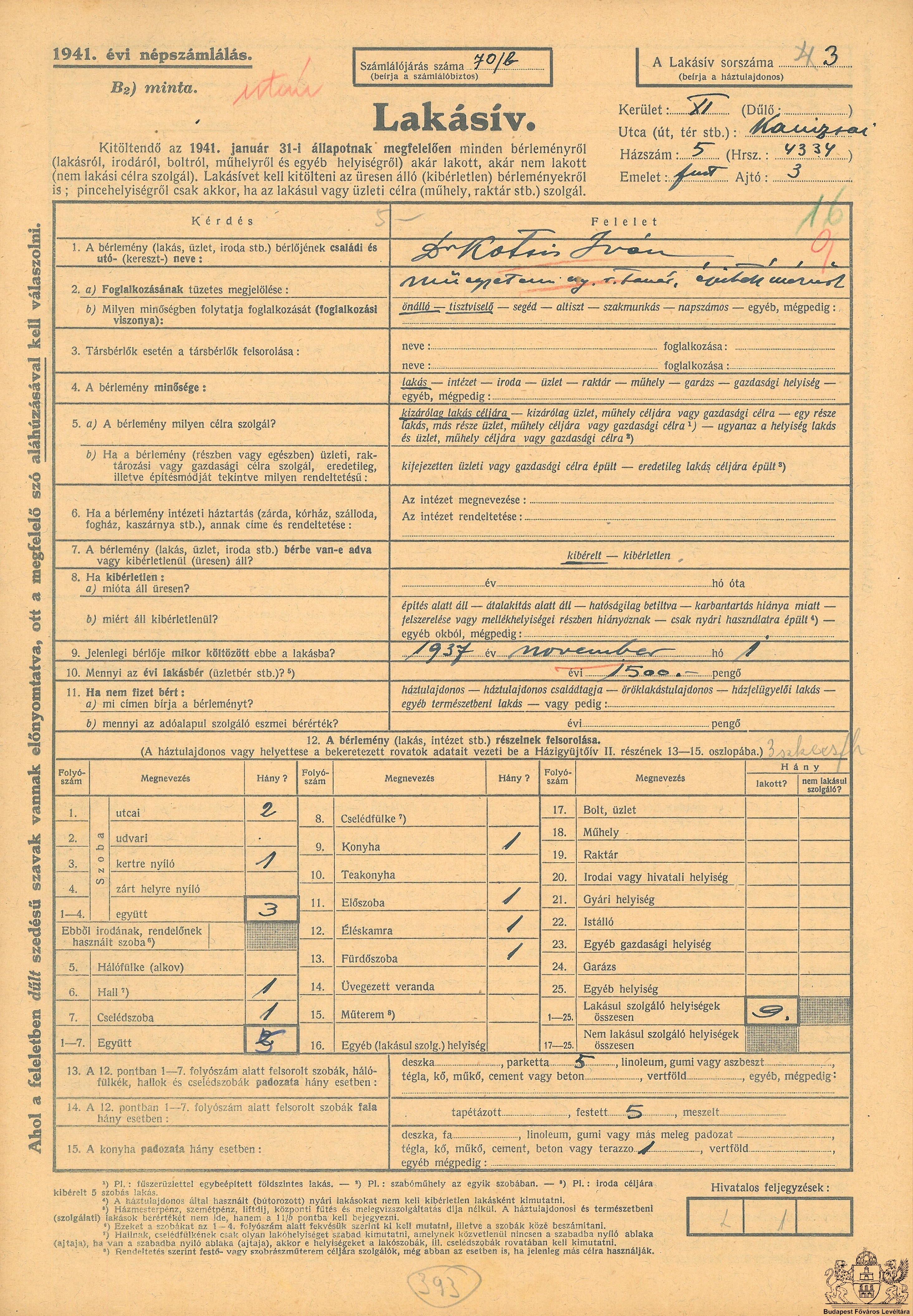 Építészek lakásai Previous Toggle image Kotsis Iván 1941. évi népszámlálási lakásíve (részlet) Subject Kotsis Iván lakása (XI. Kanizsai utca 5.) Date of creation 1941.01 Collection Budapest Főváros Levéltára Related work Építészek lakásai Reference code IV.1419.j XI. Kanizsai utca 5. fszt.3. Letöltés Previous