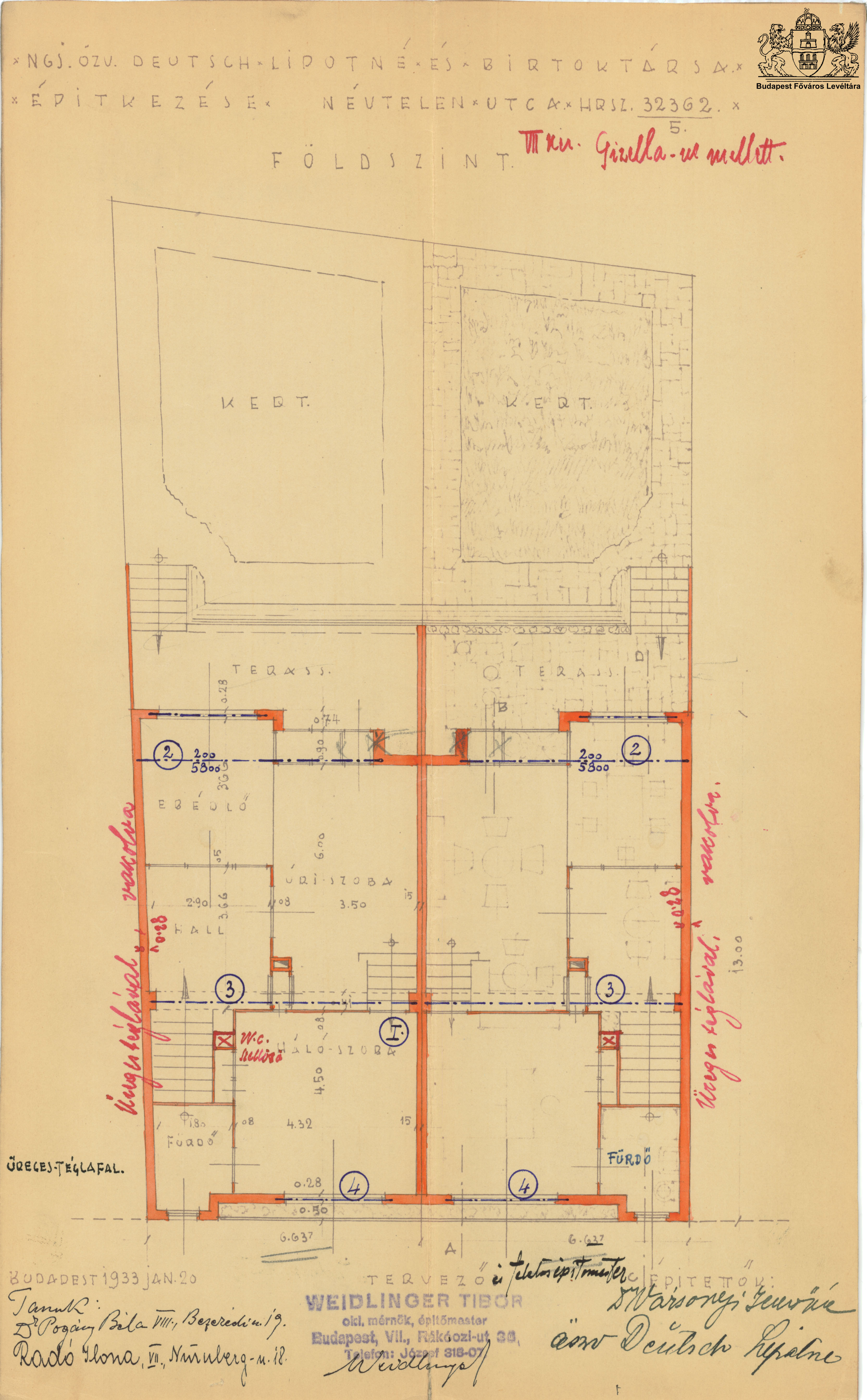 Építtető: özv. Deutsch Lipótné sz. Winker Júlia, dr. Vázsonyi Jenőné sz. Deutsch Zelma