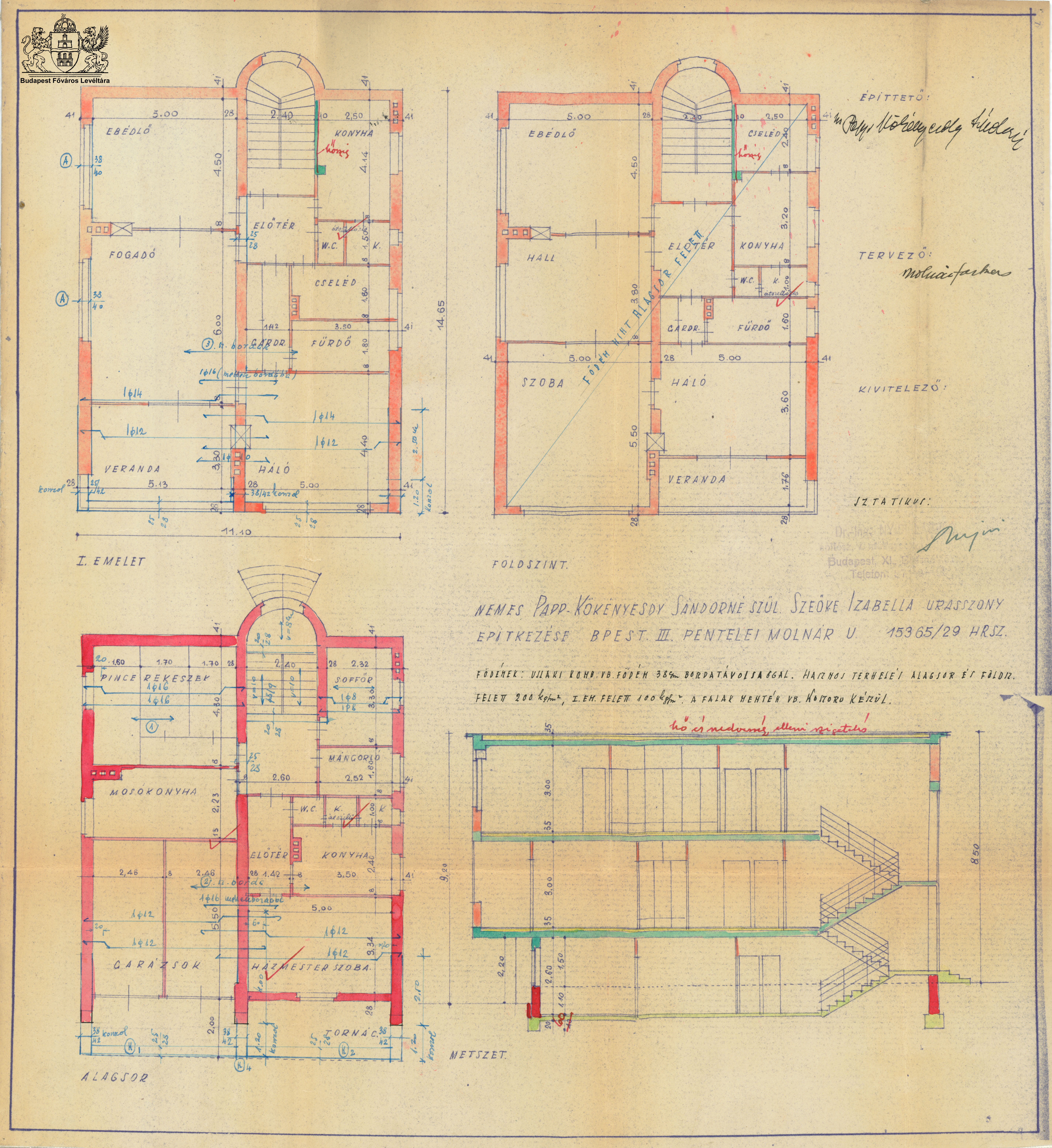 Pentelei Molnár utca 3. PreviousNext Toggle image Alaprajzok és metszet Type of document Tervek Date of creation 1939 Collection Budapest Főváros Levéltára Related work Pentelei Molnár utca 3. Reference code XV.17.d.329 Letöltés PreviousNext