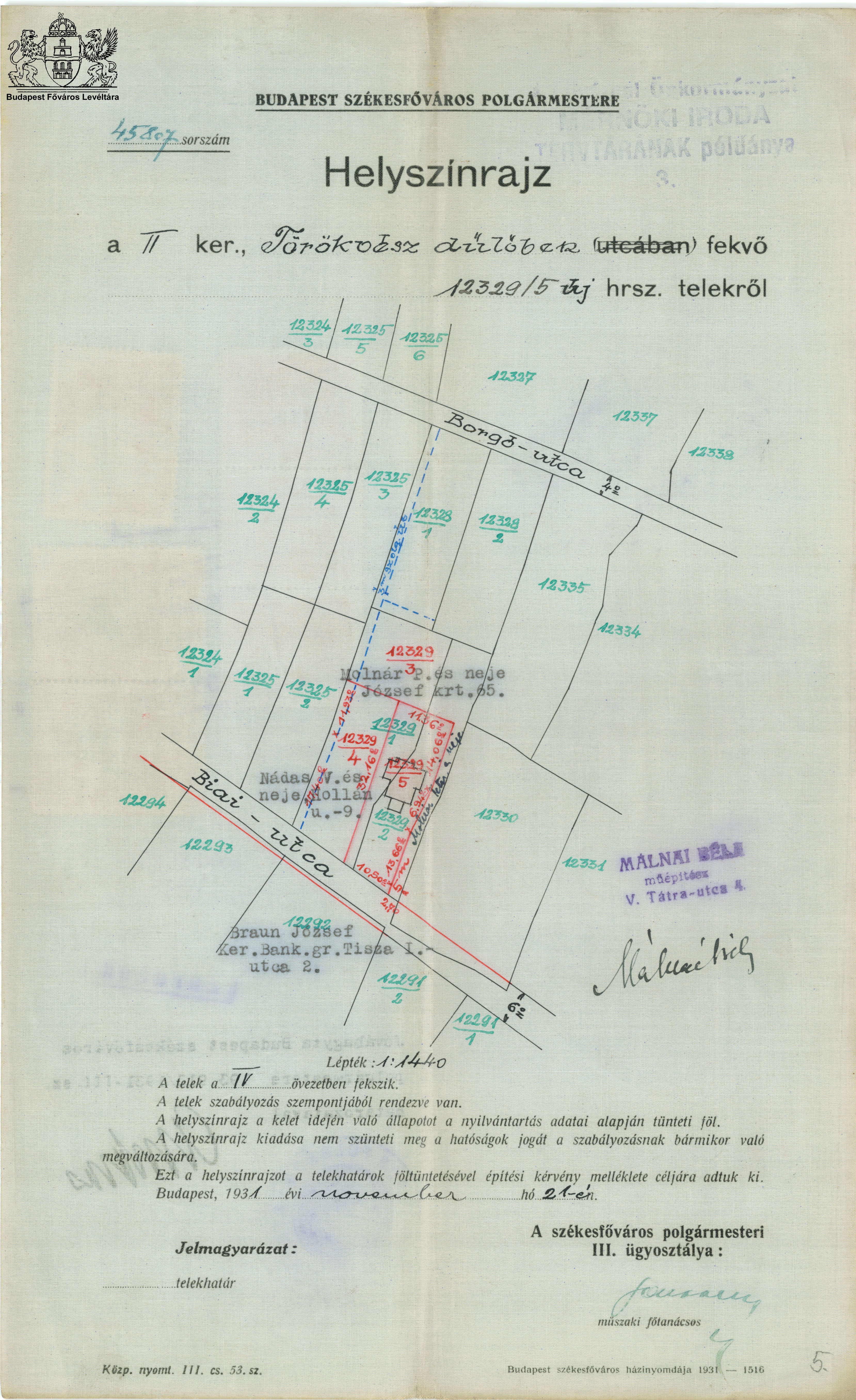 Orló utca 7. PreviousNext Toggle image Helyszínrajz Dokumentum típusa Tervek Keletkezés ideje 1931.11.21 Őrzési hely Budapest Főváros Levéltára Vonatkozó alkotás Orló utca 7. Jelzet XV.17.d.329 Letöltés PreviousNext