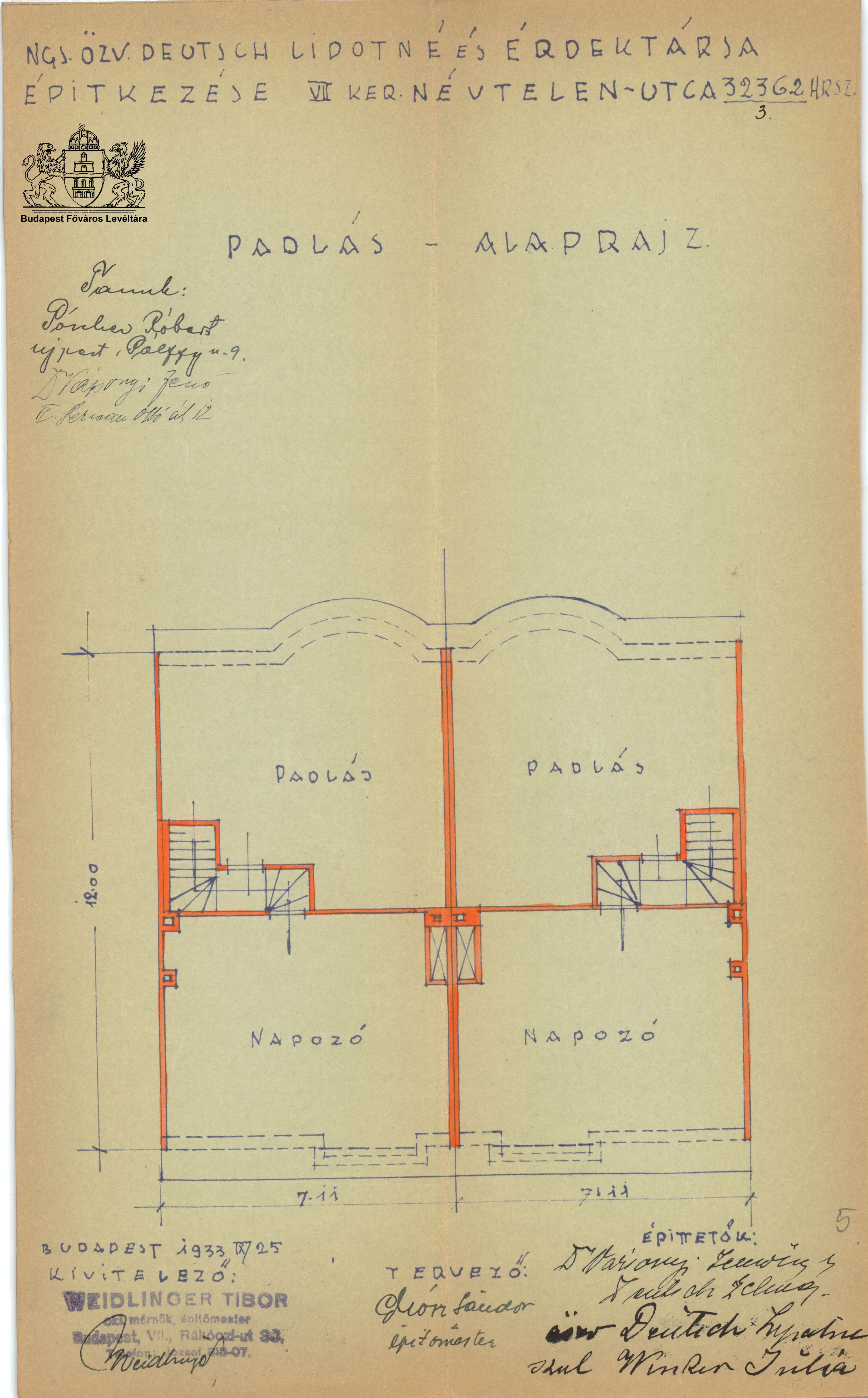 Cserei köz ikerházas beépítése PreviousNext Toggle image Padlás Építtető: özv. Deutsch Lipótné sz. Winker Júlia, dr. Vázsonyi Jenőné sz. Deutsch Zelma Tervező: Grósz Sándor építőmester Épült: 1933-1934 Dokumentum típusa Cserei köz 13-15. Keletkezés ideje 1933.09.25 Őrzési hely Budapest Főváros Levéltára Vonatkozó alkotás Cserei köz ikerházas beépítése Jelzet XV.17.d.329 32362/3 Letöltés PreviousNext